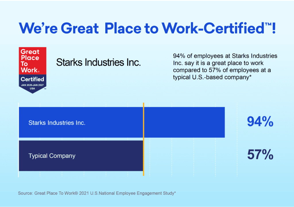 We’re especially honored that 94% of our employees say Starks Industries Inc. is a great place to work—a powerful testament to our people-first culture, collaborative environment, and shared dedication to excellence. We thank our team for their trust and engagement, and we remain committed to building a workplace where everyone can thrive.